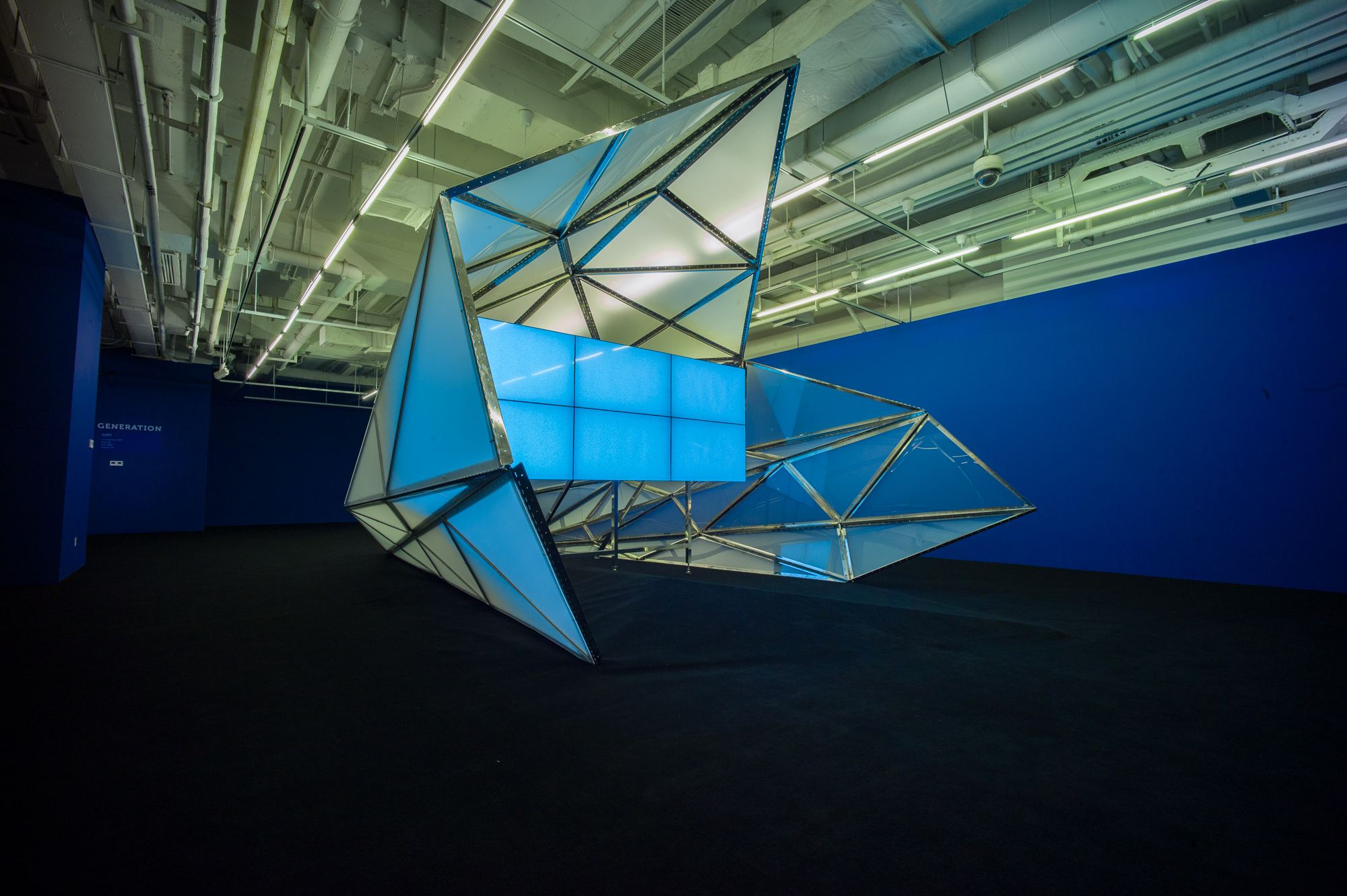 中产生的数据碎片,以十余米的金属与半透明亚克力构成的结构体,将信息以物质形态,构架起[aaajiao](https://eventstructure.com/aaajiao)[展览《屏幕一代》](https://eventstructure.com/The-Screen-Generation)空间形态。