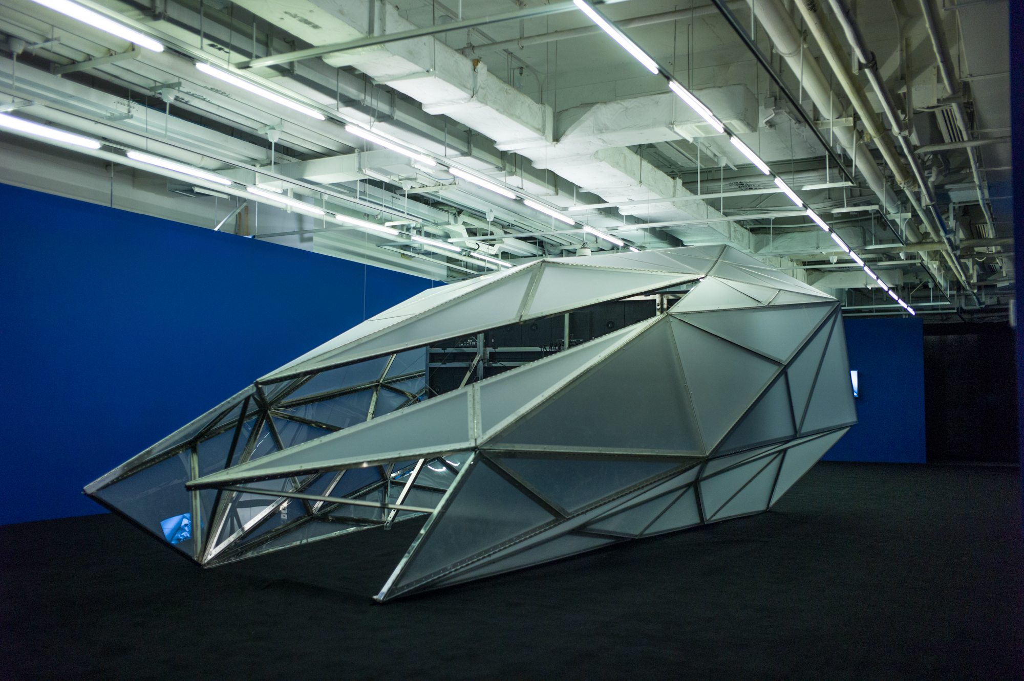 《meta structure》是"meta"系列的空间延伸。装置取形于 metameta 系列表演作品 中产生的数据碎片,以十余米的金属与半透明亚克力构成的结构体,将信息以物质形态,构架起aaajiao展览《屏幕一代》空间形态。