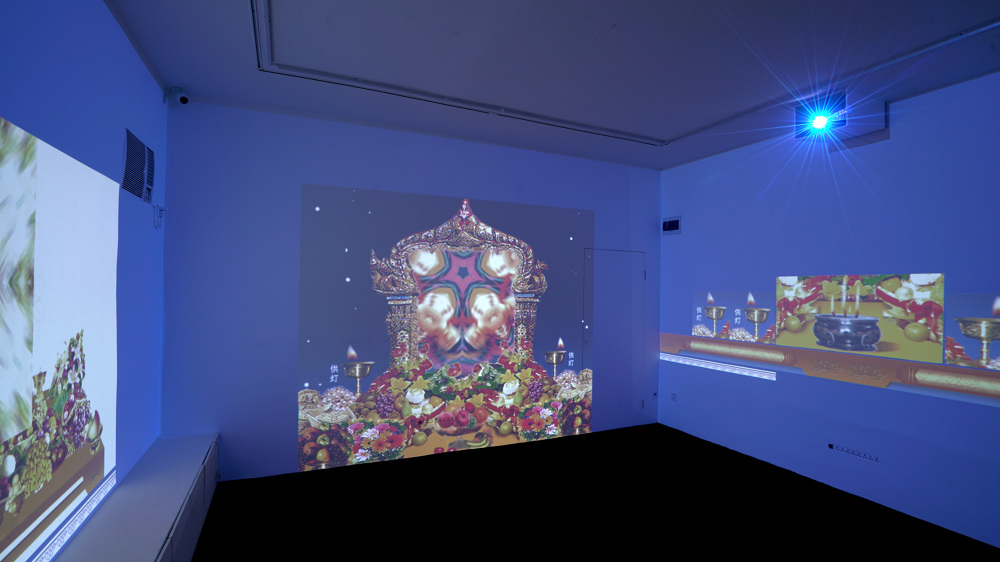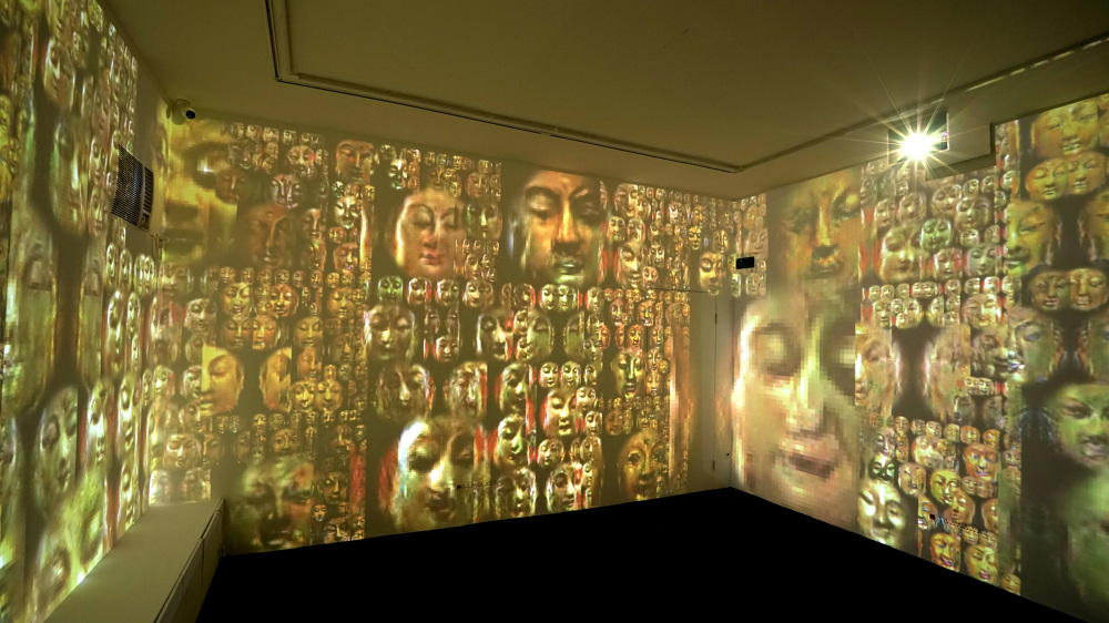 展览把这些生成的佛像横向在空间展开,试图创造一个真实与虚拟难以区分的万佛神殿。在空间里徘徊,似乎能感受到几千年的宗教视觉积淀,又有一种梦境般不真实的眩晕感。我会不由得迷恋其中。