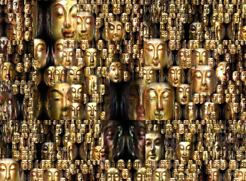 我用 GitHub 上经典的 DCGAN(深度卷积对抗网络)算法展开这次尝试。用在线工具下载成千上万张佛像图片组成数据集,让计算机开始学习。经过几百代的训练,能明显看到生成的佛像从一片混沌,变得有轮廓,变得仪态端庄,又变得匪夷所思——仿佛是人类几千年佛教视觉碎片的相互叠加,就像计算机做了一个关于佛的梦。